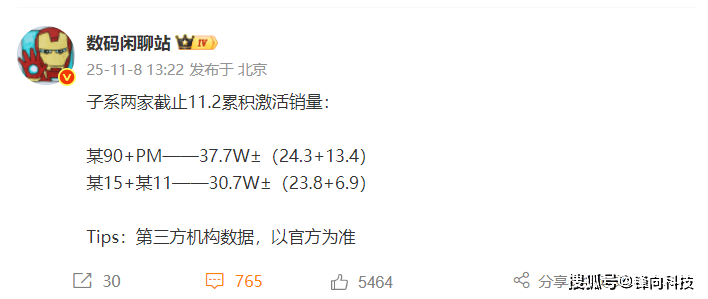 今天就给大家对比一下iQOO与REDMI最新发布的两款机型的销量数据。根据行业人士“数码闲聊站”提供的信息,截止到11月2日REDMI K90系列的整体激活量达到37.7万台,iQOO 15+iQOO Neo11的激活量达到30.7万台。其中REDMI K90的激活量为24.3万台,REDMI K90 Pro Max的激活量为13.4万台;iQOO 15的激活量为23.8万台,iQOO Neo11的激活量为6.9万台。通过简单的对比可以看出如果算系列,整体上是REDMI K90系列更强一些,如果单算iQOO 15远超REDMI K90 Pro Max,但iQOO Neo11远不如REDMI K90。