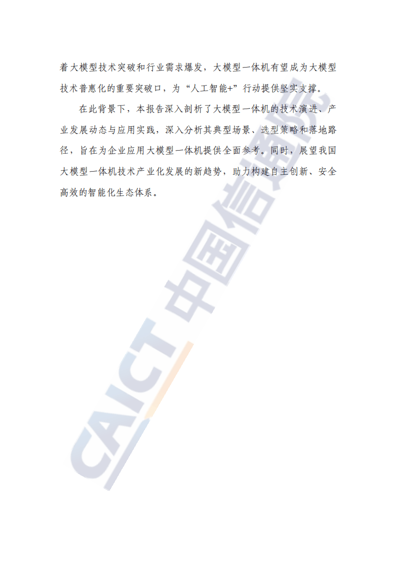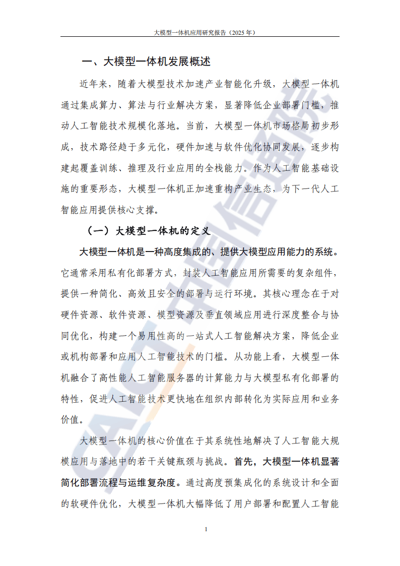 在“人工智能+”推动产业智能化升级的背景下,大模型一体机作为集成化、场景化的AI基础设施,正加速渗透千行百业。近日,中国信息通信研究院与中国人工智能产业发展联盟联合发布《大模型一体机应用研究报告(2025年)》(以下简称《报告》),从技术、产业、应用、趋势四大维度,全面剖析这一新兴业态的发展现状与未来方向。