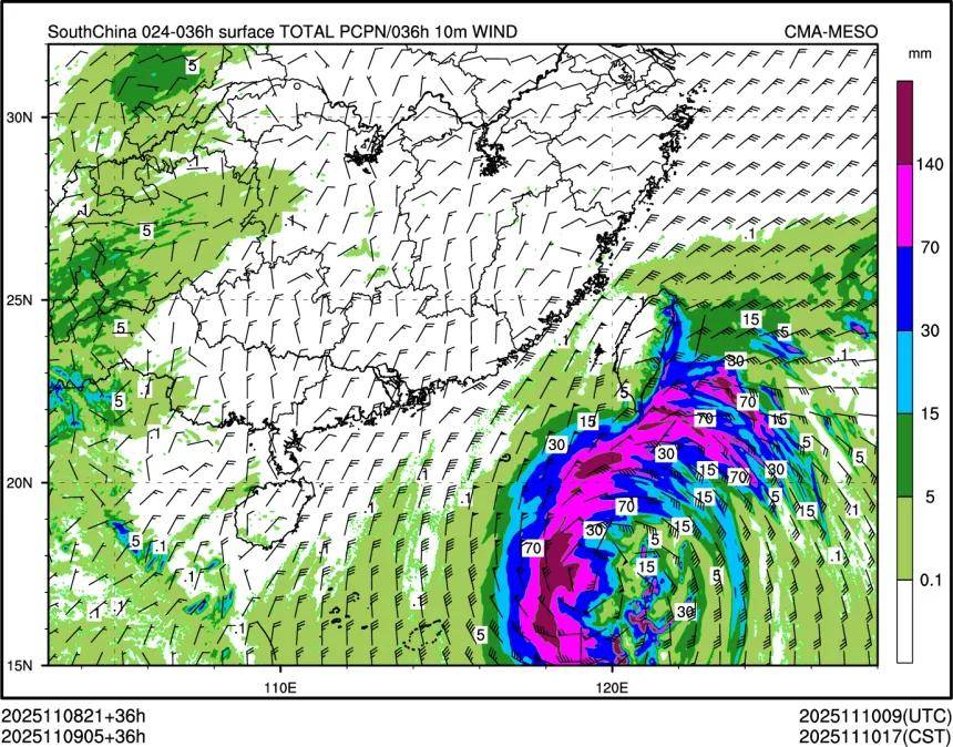 但是,也有部分数值数据认为会转弯南下,要是南下的话,强度虽然减弱不少,但是对广东的风雨范围要影响大一点。