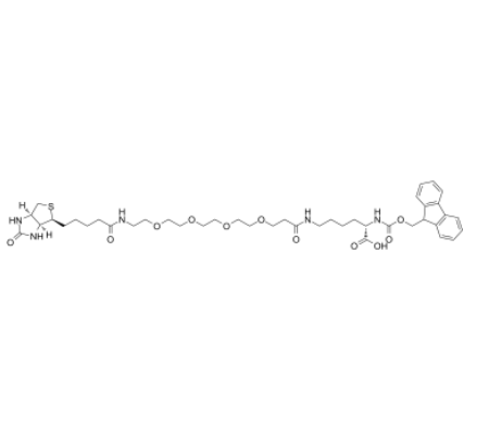 Fmoc-Lys(biotin-PEG4)-OH 是一种在固相肽合成(SPPS)中广泛应用的特殊功能化氨基酸单体,它将 Fmoc 保护的赖氨酸、生物素(biotin)基团、以及一段 PEG4(四聚乙二醇)柔性链 组合在一个结构中。该化合物主要用于在肽链中引入生物素标签,使目标分子具备更高的结合能力、空间伸展性与修饰灵活度。它是肽标记、探针构建、杂化材料设计、表面功能化等研究领域常用的模块化构件。