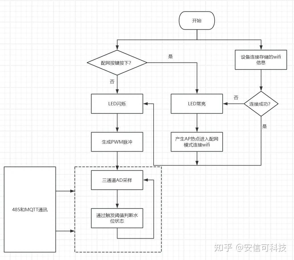 ③如果配网按键未按下,或网络连接成功后,设备在公共电极上产生PWM脉冲,通过三通道ADC实时采样副电极电压,与触发阈值进行比较从而判断水位状态。