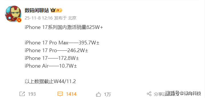 不信大家看来自行业人士“数码闲聊站”的数据,他在11月8日提供了iPhone 17系列国内的最新销量数据。这个数据是截止到11月2日的,展现的了iPhone 17系列的激活量。目前iPhone 17系列在国内的激活量已经达到825万台,也就是40天左右的时间在国内卖了800多万台。其中iPhone 17 Pro Max的激活量为395.7万台,iPhone 17 Pro的激活量为246.2万台;iPhone 17的激活量为172.8万台,iPhone Air的激活量为10.7万台。且他在与网友互动时表示iPhone 17系列的激活量很快就会突破1000万台。