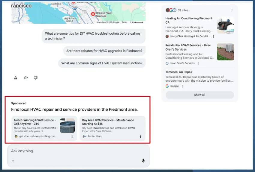 随后,另一位用户布罗迪・克拉克(Brodie Clark)证实,即使在非 Labs 的常规环境中,进行基于服务的查询时也能复现这一情况。这一发现迅速引发了科技圈的关注,标志着此前完全无广告的 AI 搜索体验开始发生改变。
