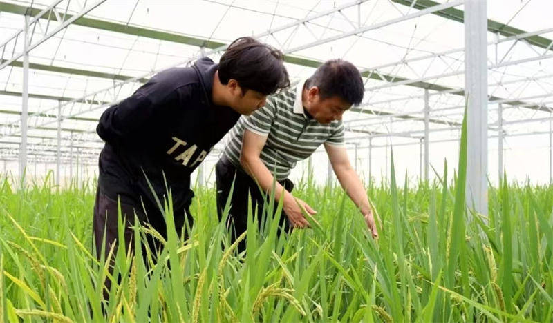 工作人员检查大棚内“太空南繁水稻”长势情况。
