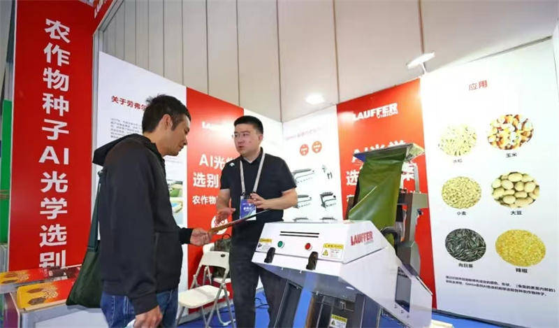 2025种子大会暨南繁硅谷论坛展览现场展出的农作物种子AI光学色选机等产品。