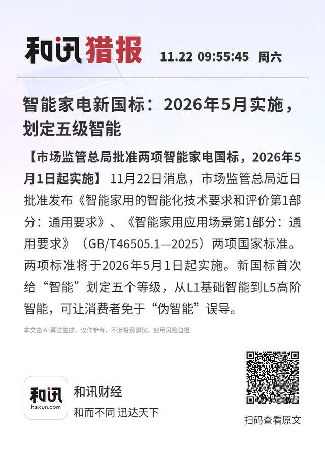 【市场监管总局批准两项智能家电国标,2026年5月1日起实施】11月22日消息,市场监管总局近日批准发布《智能家用的智能化技术要求和评价第1部分:通用要求》、《智能家用应用场景第1部分:通用要求》(GB/T46505.1—2025)两项国家标准。 两项标准将于2026年5月1日起实施。新国标首次给“智能”划定五个等级,从L1基础智能到L5高阶智能,可让消费者免于“伪智能”误导。