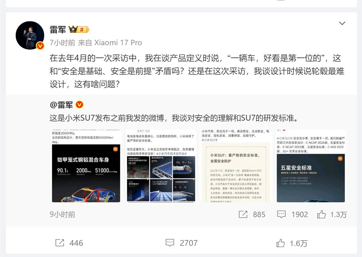 雷军又发了另外一条,表示2023年底和2024年初的,看来雷军很重视今天关于小米汽车的安全截图。接着又马上转发一条,然后提起表示去年4月一次采访中,说谈产品定义时说,“一辆车,好看是第一位的”,这和“安全是基础、安全是前提”矛盾吗?还是在这次采访,我谈设计时候说轮毂最难设计,这有啥问题?