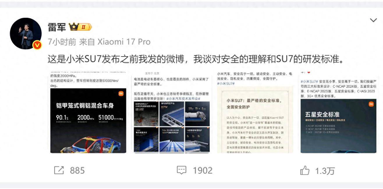 雷军连续发布内容,主要是汽车安全的话题,第一条雷军表示:这是小米SU7发布之前我发的微博,我谈对安全的理解和SU7的研发标准。