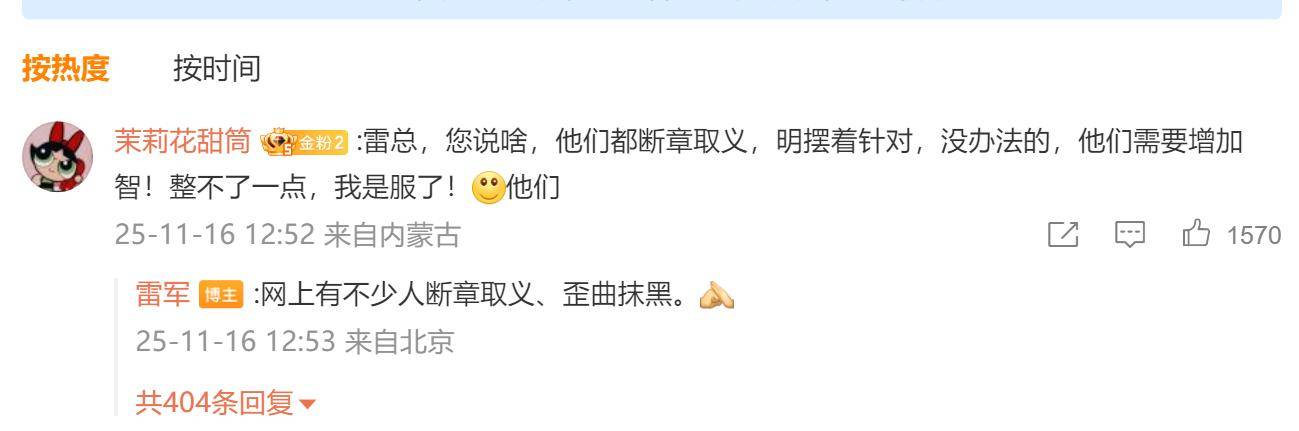 雷军在评论区回复这条则是表示,“网上有不少人断章取义,歪曲抹黑”。