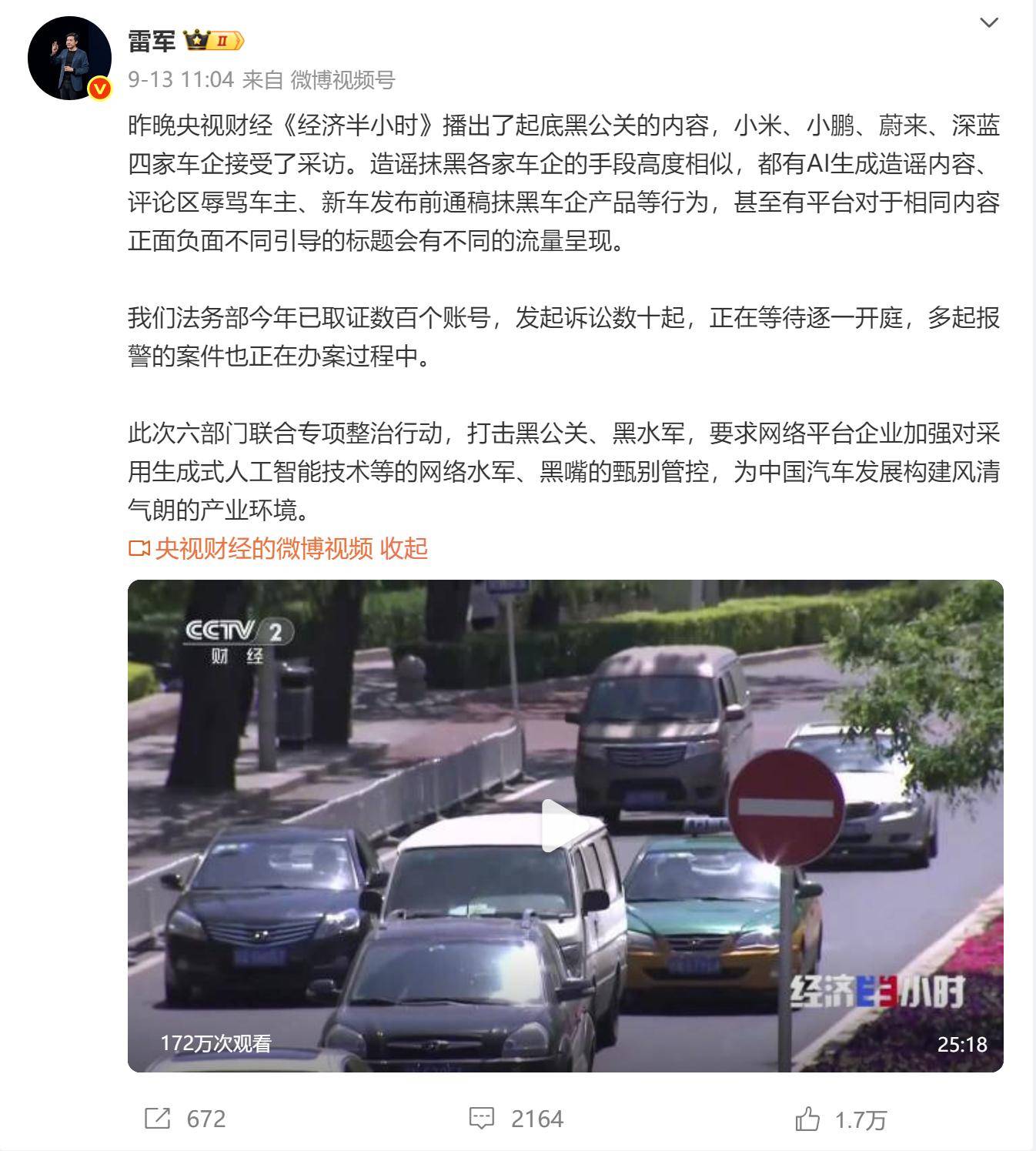 雷军在发布会也曾经讲过被抹黑的事情,也提到了黑公关黑水军,小米和雷军关注度热度确实非常高,从手机到汽车等产品曝光度成绩也都非常好,雷军9月份也专过专门内容,表示一些抹黑手段高度相似,然后表示小米法务部今年已取证数百个账号,发起诉讼数十起,正在等待逐一开庭,多起报警的案件也正在办案过程中。