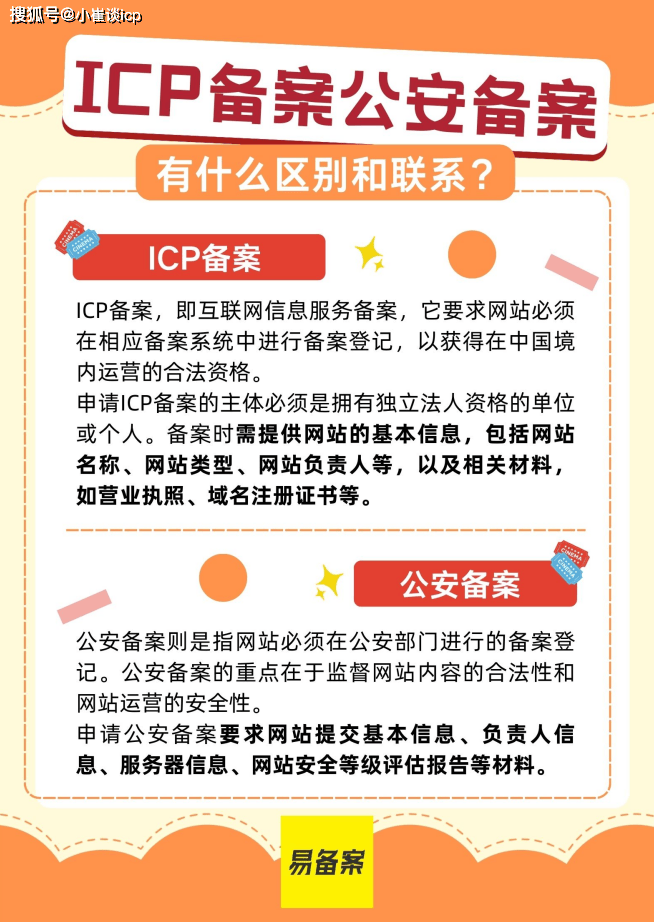 区别:ICP备案和公安备案的主要区别在于管理部门、备案要求和目的的不同。ICP备案侧重于对『互联网』信息服务提供者的监管,确保信息服务的合法性和质量;而公安备案则更侧重于对网站内容和运营安全性的监管,确保网络环境的稳定和安全。