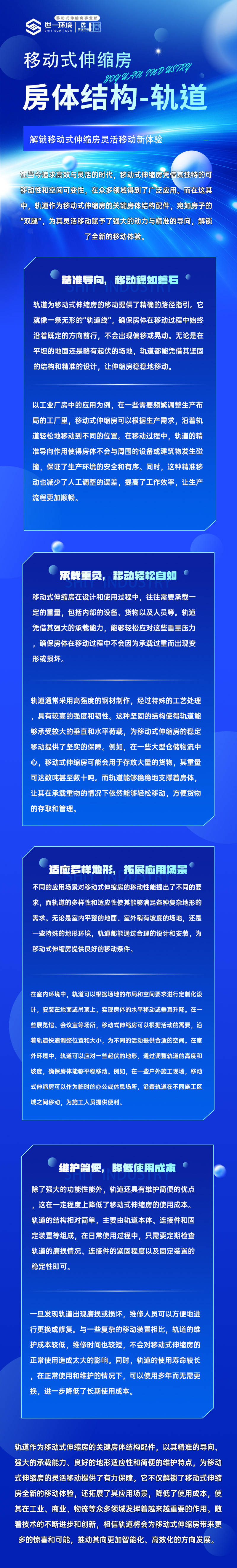轨道系统看似是伸缩房的 “附属组件”,实则是工业空间 “柔性化转型” 的核心载体 —— 它通过精准导向实现 “空间效率提升”,通过强承载拓展 “功能边界”,通过全地形适配覆盖 “多场景需求”,通过低维护保障 “长期价值”。