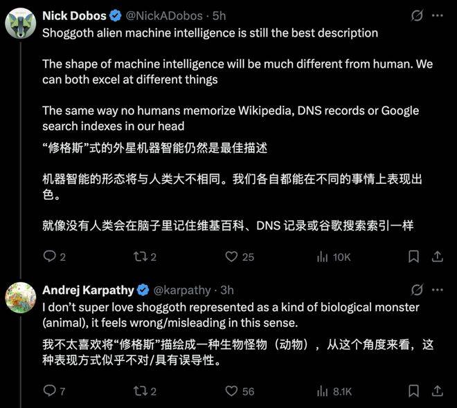 Karpathy则回复表示,将「修格斯」描绘成动物可能会有误导性。看来,他非常警惕所有将AI与动物智能联系起来的说法。