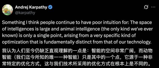 Karpathy在推文中提到,智能的空间非常广阔,而动物智能(包括人类智能)只是其中的一个点。