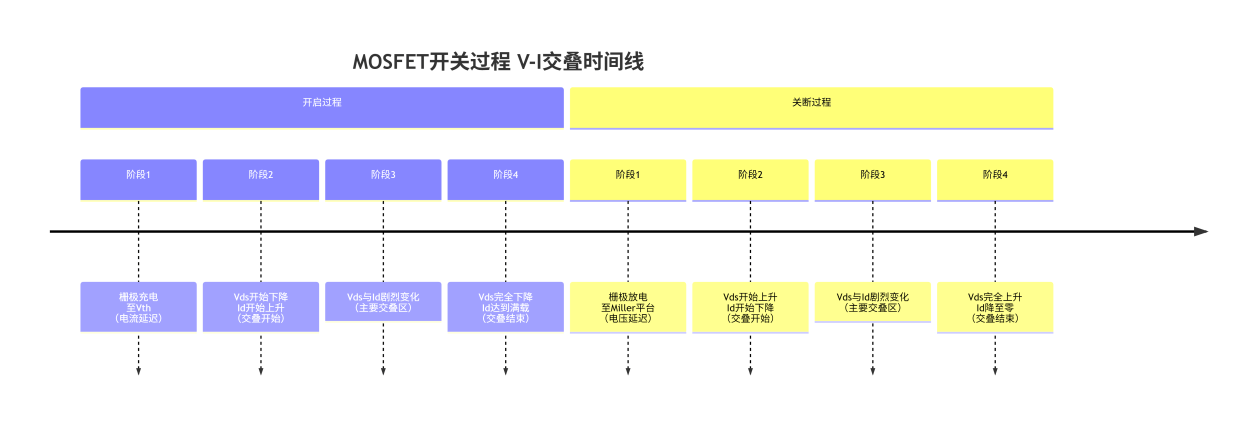 物理本质: MOS管并非理想的开关,其在开启和关断过程中存在一个短暂的“过渡区”。在此区域内,漏源电压Vds和漏极电流Id同时处于高位,产生巨大的瞬时功率 Pinstant=Vds(t)×Id(t)Pinstant=Vds(t)×Id(t) 。这个瞬时功率在时间上的积分,就是开关损耗。