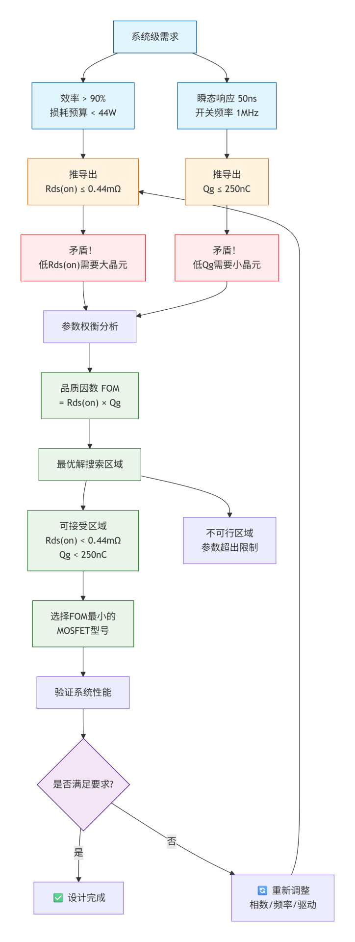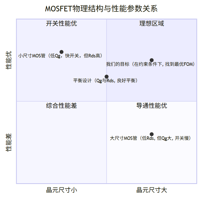 结论: 为了在1MHz下实现快速开关,我们“算”出了MOS管的总栅极电荷Qg必须低于250 nC。然而,这与我们之前对低Rds(on)的需求是矛盾的!因为要获得极低的Rds(on),通常需要更大的晶元面积,这会导致更大的栅极电容(Ciss)和Qg。