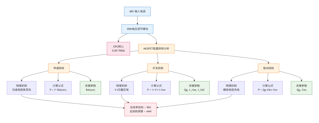 能量从输入电容流向GPU核心,每一次经过MOS管,都会留下“买路钱”——损耗。这些损耗本质上是电能转化为热能的三种不同路径。