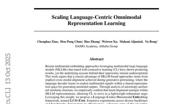 A:语言中心的全模态嵌入学习(LCO-EMB)是阿里巴巴团队提出的AI训练方法,核心思想是以语言为中心来训练AI模型处理图片、音频、视频等多种信息的能力。就像只教孩子更好地理解语言,结果发现他在理解图片和音乐方面的能力也自动提升了。这种方法比传统方法使用的训练数据少21倍,但效果更好。