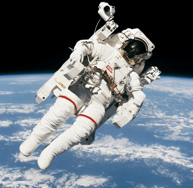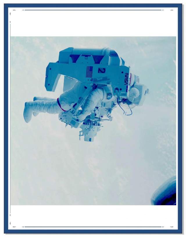 四天后,2月7日,历史性的时刻到来了,气闸舱的门缓缓打开,布鲁斯背着巨大的白色MMU,像一个背着壳的蜗牛,缓缓飘入真空,他的面前,是深不见底的黑色宇宙,他的身后,是高速掠过地球表面的航天飞机。
