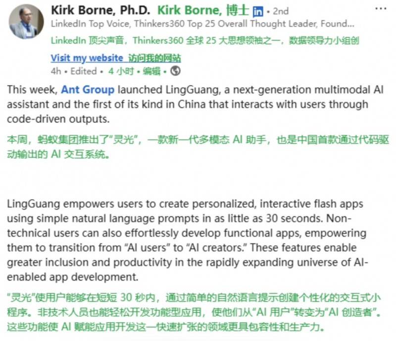 在领英拥有9.6万粉丝的美国AI战略专家Kirk Borne认为,“闪应用”功能提升了AI应用的包容性和生产力:“非技术人员也能轻松开发功能型应用,使他们从‘AI用户’转变为‘AI创造者’。”