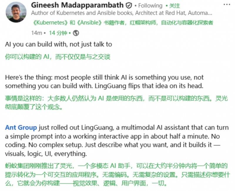 新加坡AI领域KOL Madapparambath表示,灵光降低了开发门槛,创新了普通用户与AI的交互方式:“大多数人仍认为AI是用来使用的东西,而不是可以主动构建的东西——灵光彻底颠覆了这一观念。”