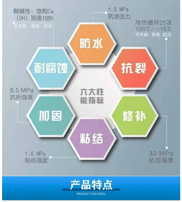 3、耐久性与适应性抗冻融循环≥150次,使用寿命达30年以上,可在潮湿基面施工,固化收缩率低,适应性广。