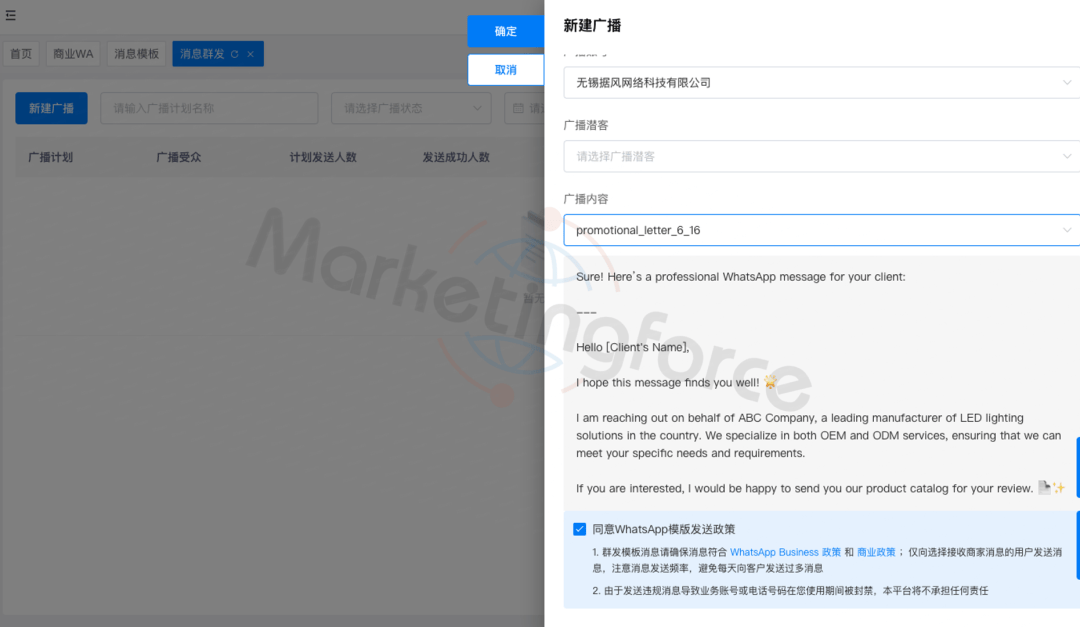 以WhatsApp沟通为例,系统不仅内置了经过平台审核的消息模板库,还关联了用户许可管理模块,实现了从用户授权、消息发送到退订管理的全流程合规管控。这种“合规先行”的设计理念,帮助企业有效规避了跨境营销中的法律风险,保障了品牌声誉与用户信任。