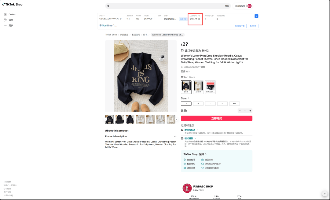 TikTok Shop 11月8日上架的热门商品,Sorftime TikTok 专业版 第2天成功抓取并分析。
