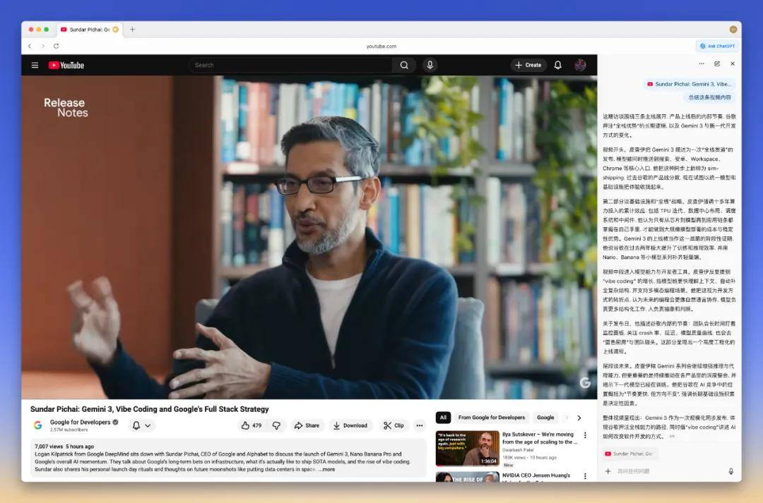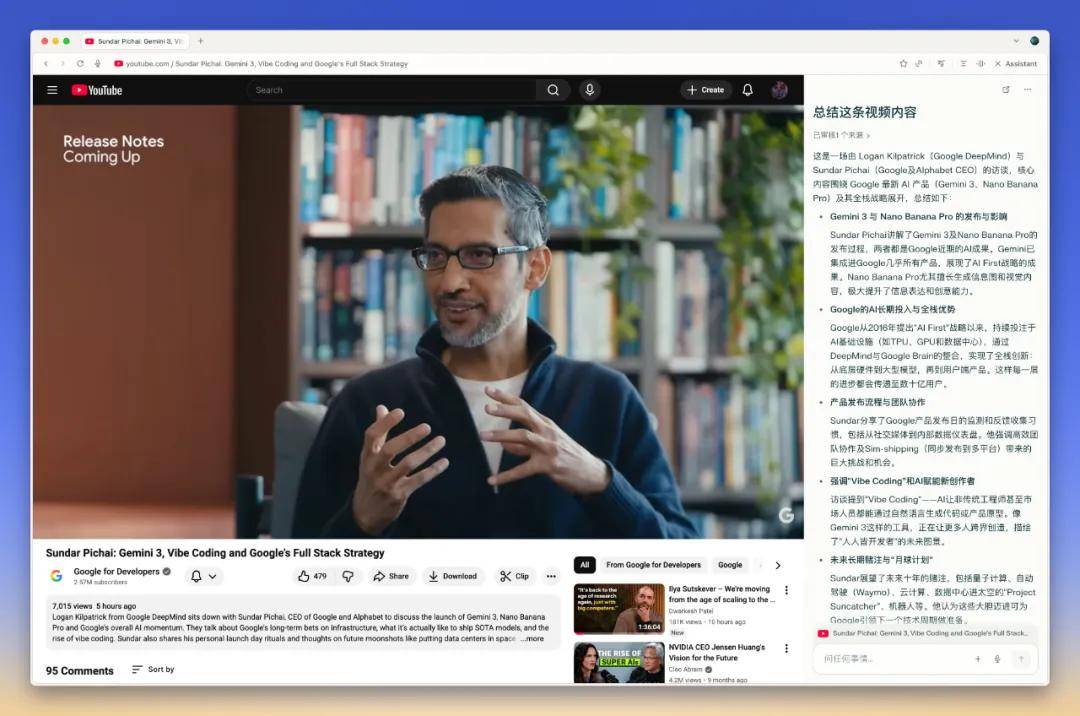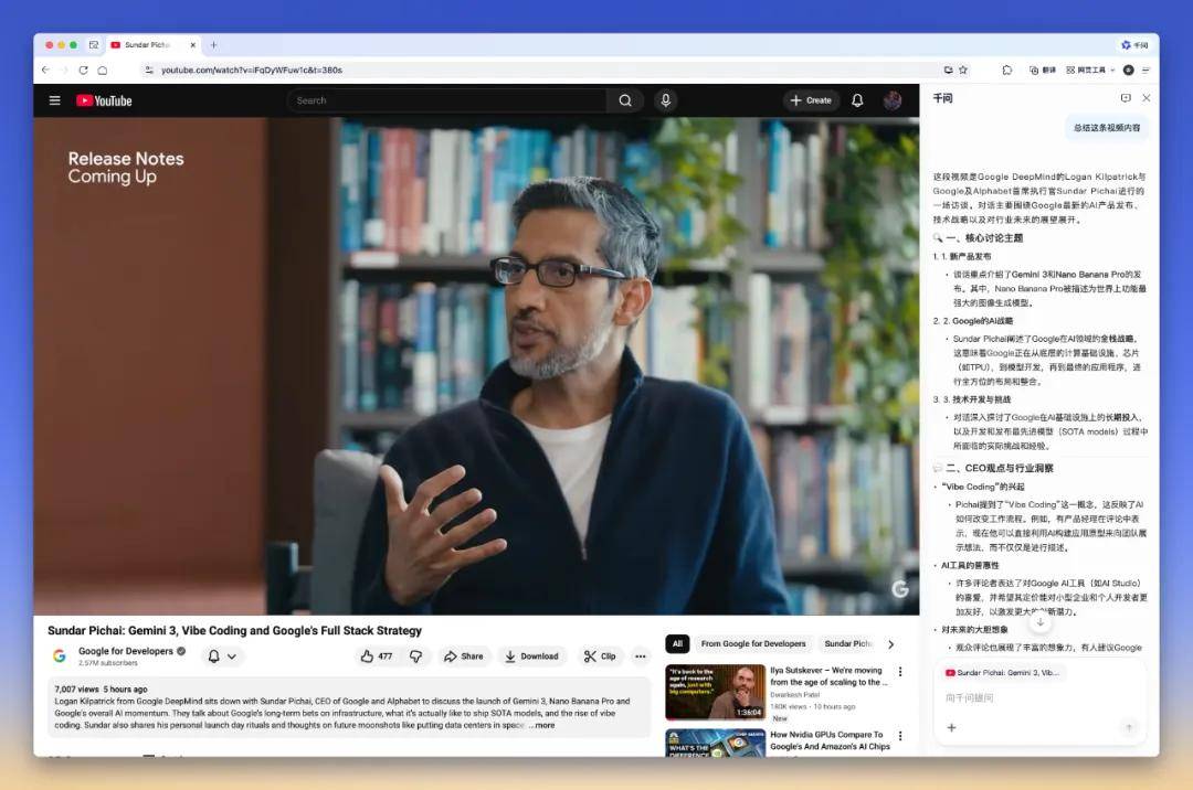 比如打开一条谷歌 DeepMind 团队对皮查伊的访谈视频,就可以让千问对视频内容进行总结和分析。分别与 Atlas 和 Comet 进行对比,千问在响应速度上明显快上不少,对视频内容的总结也更有条理和更具结构化。(Google 虽然也在 『Chrome』 中加入了 Gemini 助手,但开启条件过于严苛,仅限美国区域及英文语言,故未进行对比测试)