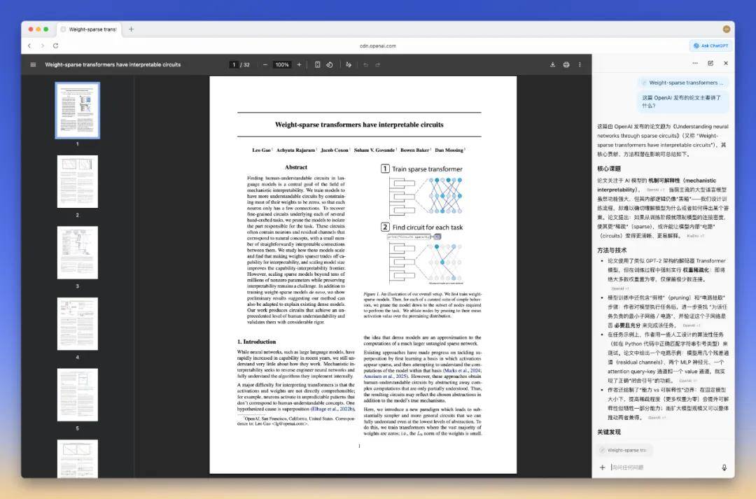 千问的论文研读能力也进一步体现出来。相同一篇 OpenAI 发布的 32 页技术论文,千问甚至比 ChatGPT 更全面也更详细。比如,千问会从研究背景、训练方式、实验结果到未来方向、技术局限等多维度有条理地输出总结,ChatGPT 虽然也遵循了技术研究的框架输出,但信息密度却明显低于千问,在技术讲解上更显空泛。