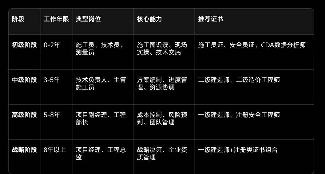 建筑工程技术专业的职业发展路径清晰,通常可分为四个阶段。每个阶段都有对应的能力要求和证书目标,合理规划能让你少走弯路,快速晋升。