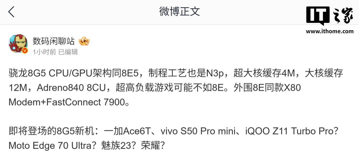 同时博主还在文中透露了即将登场的 8 Gen 5 『芯片』新机:一加 Ace 6T、vivo S50 Pro mini、iQOO Z11 Turbo Pro?Moto Edge 70 Ultra?魅族 23?荣耀?