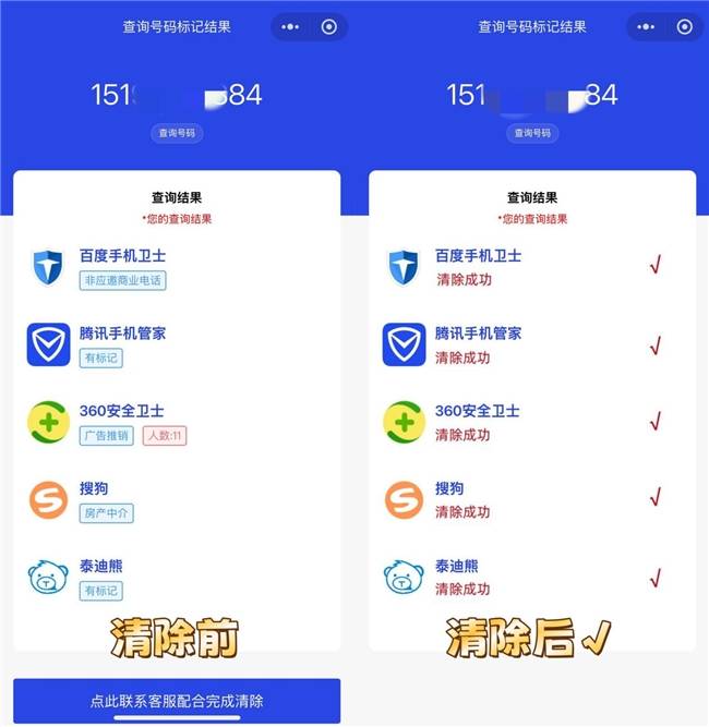 手机号码被标记后,无论是 “广告推销” 还是 “骚扰电话” 标签,都会严重影响日常沟通 —— 亲友担心诈骗拒接,客户看到标记直接挂断,甚至重要的工作对接、生活通知也会被拦截。更麻烦的是,标记会同步到百度手机卫士、腾讯手机管家、泰迪熊🧸、360 手机卫士等多个平台,手动进行号码标记清除,需要逐个平台申诉,流程繁琐且效果不佳,往往耗费大量时间还无法彻底清除。