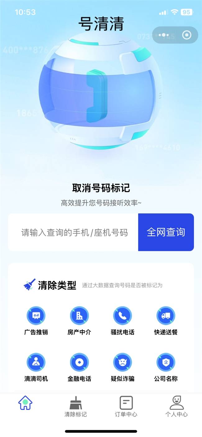 想高效完成手机号码标记清除,无需逐个平台折腾,搜索【号清清】服务号或小程序就能一站式解决。打开小程序后,点击 “标记清除 - 手机号专属” 入口,输入被标记的手机号码,系统会自动扫描所有主流平台的标记记录,生成 “全平台标记清单”,明确标注各平台的标记类型和标记时间,无需手动查询,让标记情况一目了然。