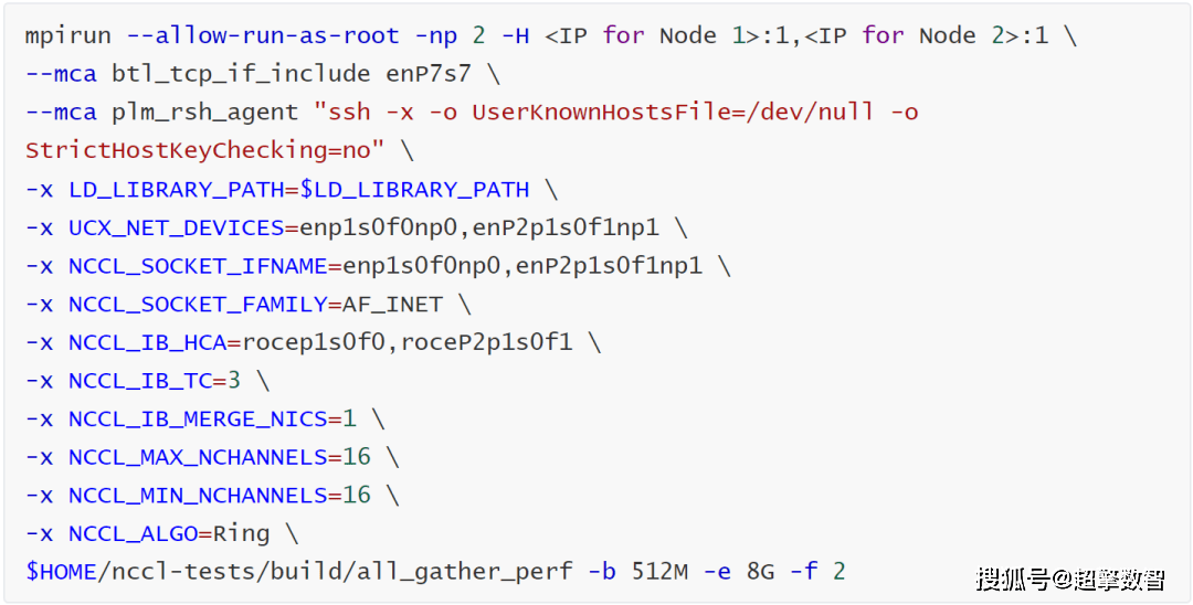 执行以下命令以运行NCCL通信测试。替换上一步中使用的接口名称。