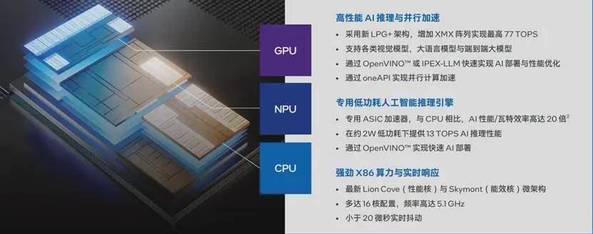一个是 oneAPI ,一条贯通 CPU/GPU/NPU 的「算力高速路」。开发者写一次代码,系统自动决定跑在哪颗单元上,CPU、GPU、NPU 甚至 FPGA,全自动调度与优化。