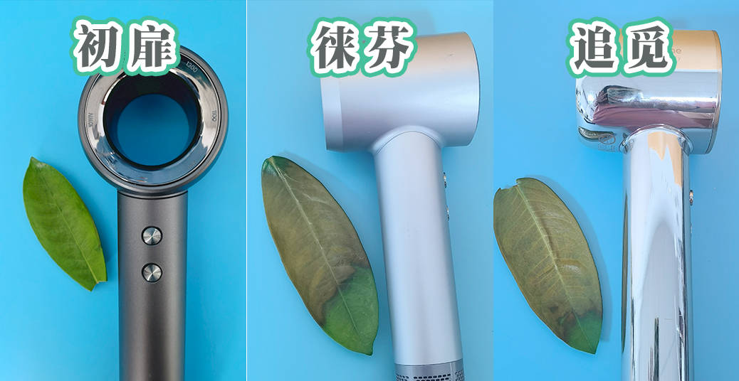 这三款高速电吹风机的养发表现,同样是选购时的重要参考维度。我们设计了贴近发丝养护原理的测试:选取三组新鲜度、含水量一致的叶片,将三款产品调至相同档位,对叶片进行持续3分钟的定向吹拂;之后通过观察叶片的颜色留存度与整体状态,间接反映各机型对头发的滋养与保护能力。