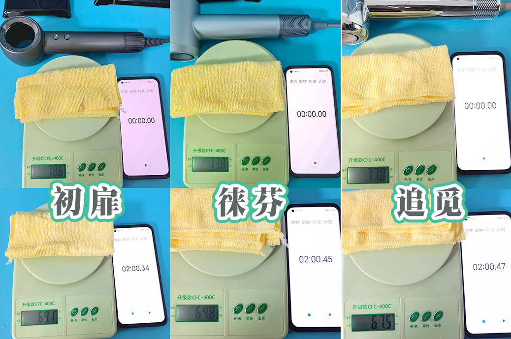 干发效率是评估产品性能重要的一点,我们的测试方案如下:选取三条同款毛巾,用称量器精准测定初始含水量后,然后使用秒表计时;将三款产品统一调至相同档位,对毛巾进行同等时长的吹拂;最终通过称量毛巾减少的水分克数,对比各自的干发能力。