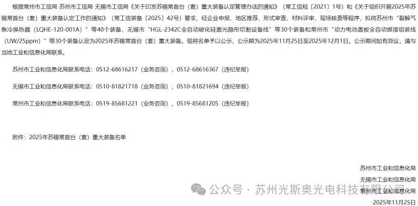11月25日,2025年苏锡常首台(套)重大装备名单公示,苏州光斯奥光电科技有限公司自主研发的装备《车载新型显示屏全制程智能贴合线(KFJ01)》成功入选!