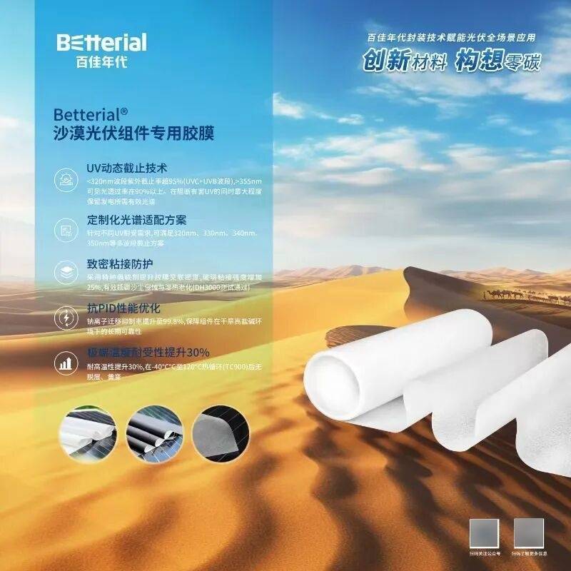 在全球 “双碳” 目标引领下,百佳年代以创新材料为核心支点,深度赋能能源转型。作为高分子功能薄膜创新应用引领者,公司不仅在 TOPCon、HJT、钙钛矿等前沿光伏技术领域实现封装材料迭代升级,更通过沙漠专用胶膜、轻质组件材料等全场景解决方案,破解极端环境与特殊场景的能源开发难题。