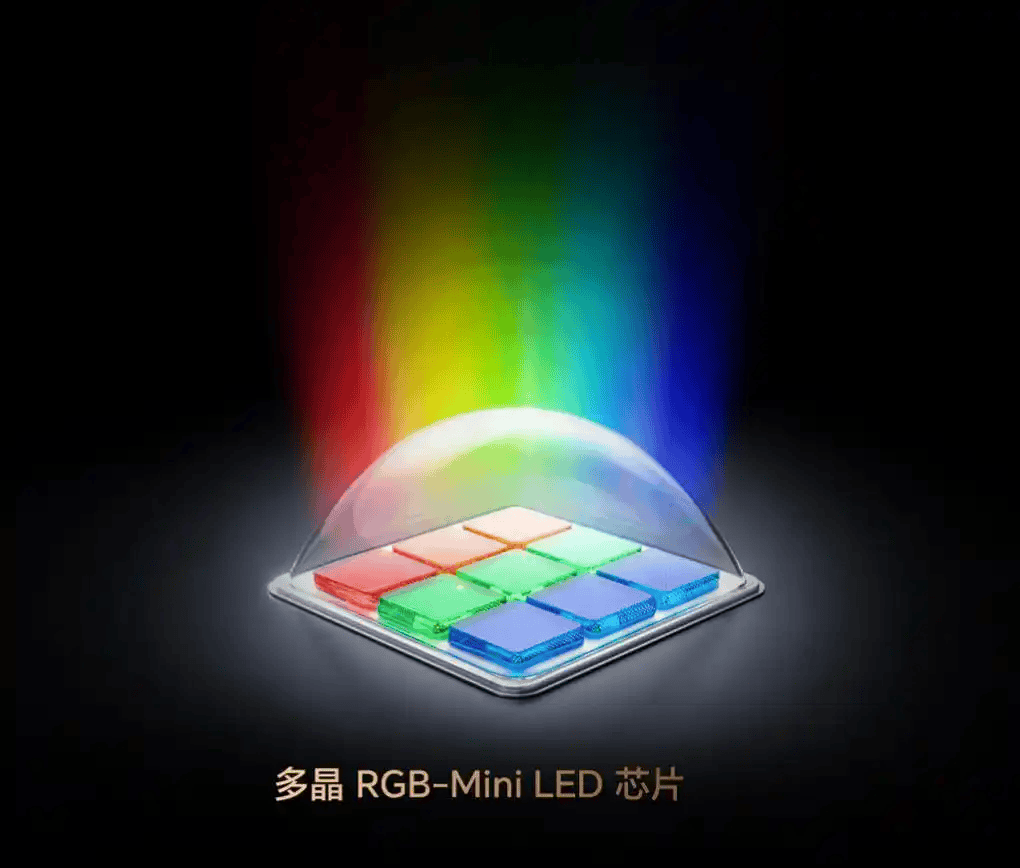 RGB-Mini LED是最新代的液晶显示技术,能最大程度的还原大自然真实色彩。它在每颗背光灯珠中集成了红、绿、蓝三色发光『芯片』,无需进行二次色彩转换,从光源上保证了色彩的纯净度,能轻松实现100% BT.2020广色域和近乎100%的色彩纯度。相比传统Mini LED技术,它在色彩与观影舒适度上全面领先;对比OLED,则在保持优秀画质的同时,解决了大尺寸价格高、能耗高的问题。