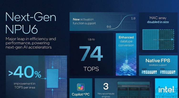 于是乎,英特尔在Lunar Lake上推出了48TOPs的“NPU4”,在Panther Lake上则会将其更新到具有50TOPs算力的“NPU5”。根据目前的爆料信息,我们最快明年就会看到搭载74TOPs算力“NPU6”的NovaLake处理器面世。