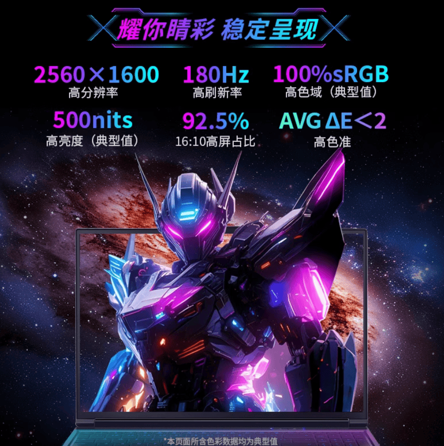 旷世X的16英寸专业电竞屏,将游戏视觉体验提升到了一个全新高度。2560×1600的超高分辨率,配合16:10的黄金比例,让画面细节分毫毕现,视野更加开阔。180Hz的高刷新率,是普通60Hz屏幕的3倍,动态画面如德芙般丝滑。在高速运动的游戏场景中,你能精准捕捉每一帧关键信息,先发制人。100% sRGB广色域覆盖,色彩真实饱满,为你带来身临其境的视觉盛宴。