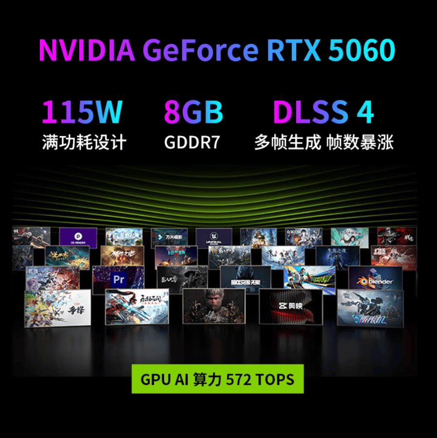 显卡方面则配备了满功耗版RTX 5060笔记本📓电脑💻️GPU。基于新一代NVIDIA Blackwell架构,并配备8GB GDDR7显存。在DLSS 4等先进技术的加持下,足以在2.5K分辨率下全开特效,流畅征服各类3A大作,让你沉浸于每一个光影真实的游戏世界。