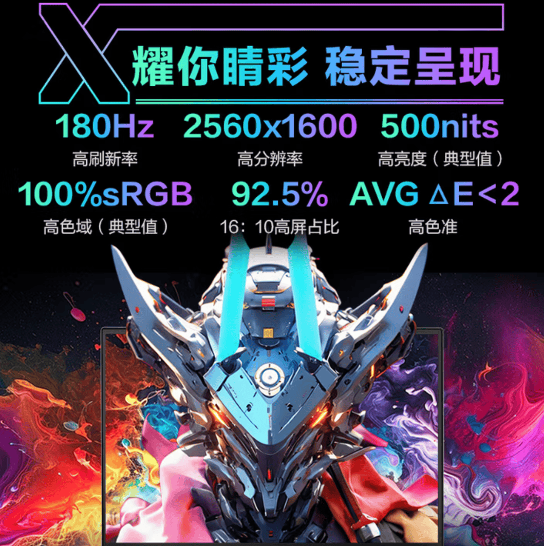极光X配备了一块16英寸专业电竞屏,拥有2560×1600分辨率、16:10黄金比例、180Hz高刷新率及100% sRGB广色域覆盖。180Hz超高刷新率是普通60Hz屏的3倍,配合RTX 50系显卡的强大性能,能呈现出丝滑流畅、无拖影的战斗画面,助你精准捕捉每一瞬战机,决胜分毫之间。