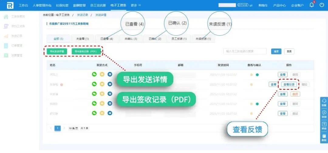 🔹三渠道一键群发:确认数据后,可一键同时向3000名员工发送工资条。系统会根据员工预留的联系方式,自动通过微信、短信、邮件三种渠道送达,确保触达率高达99%以上,完美覆盖不同使用习惯的员工。