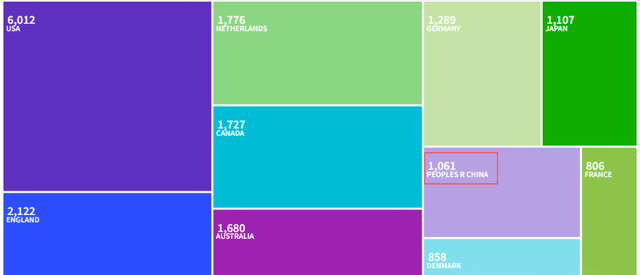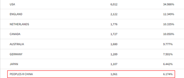 作为一本国际化期刊,期刊的稿件来源仍以美英国家为主。其中,美国学者累计发文6012篇,占比约34.986%。英国学者则发文2122篇,占比12.349%。中国学者则累计发文1061篇,占比约6.174%,位列第8。