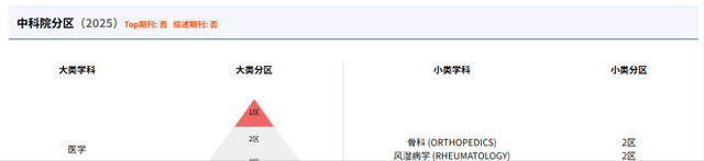 期刊在中科院分区-2025为:大类分区:医学:1区;中科院小类分区为:骨科:2区;风湿病学:2区。