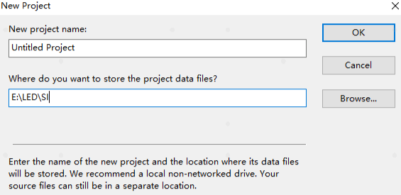 3、选择工程数据文件存储位置(建议在源码目录外单独创建文件夹),点击 OK 完成工程命名和创建。