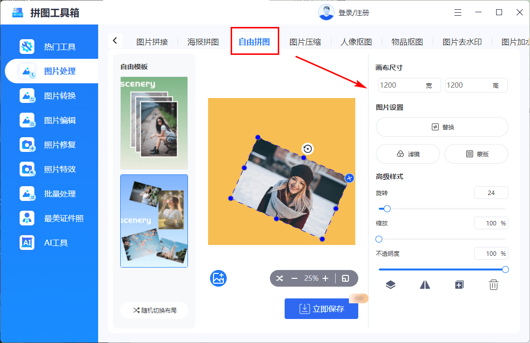 它提供了极高的自由裁切与布局能力。你完全可以打破常规的矩形边框,根据每张照片的主体形状,进行个性化的裁剪,同时在画布上自由组合它们的位置、角度与层级。让创造独特的“视觉动线”变得非常直观。